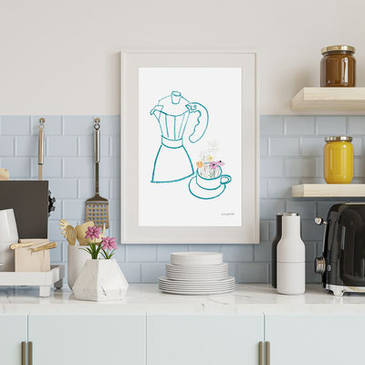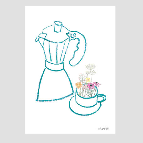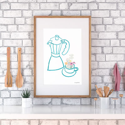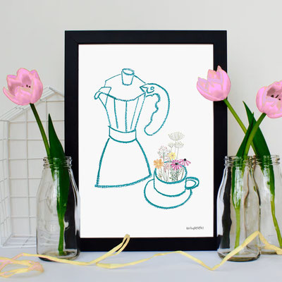 Noi abbiamo disegnato la caffettiera perché fa parte della nostra vita! Il caffè si beve in compagnia, si offre agli amici e vedere appesa questa stampa in cucina, con i fiori nella tazzina, ci fa iniziare meglio la giornata!
